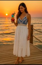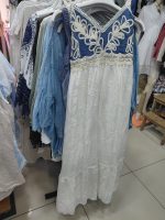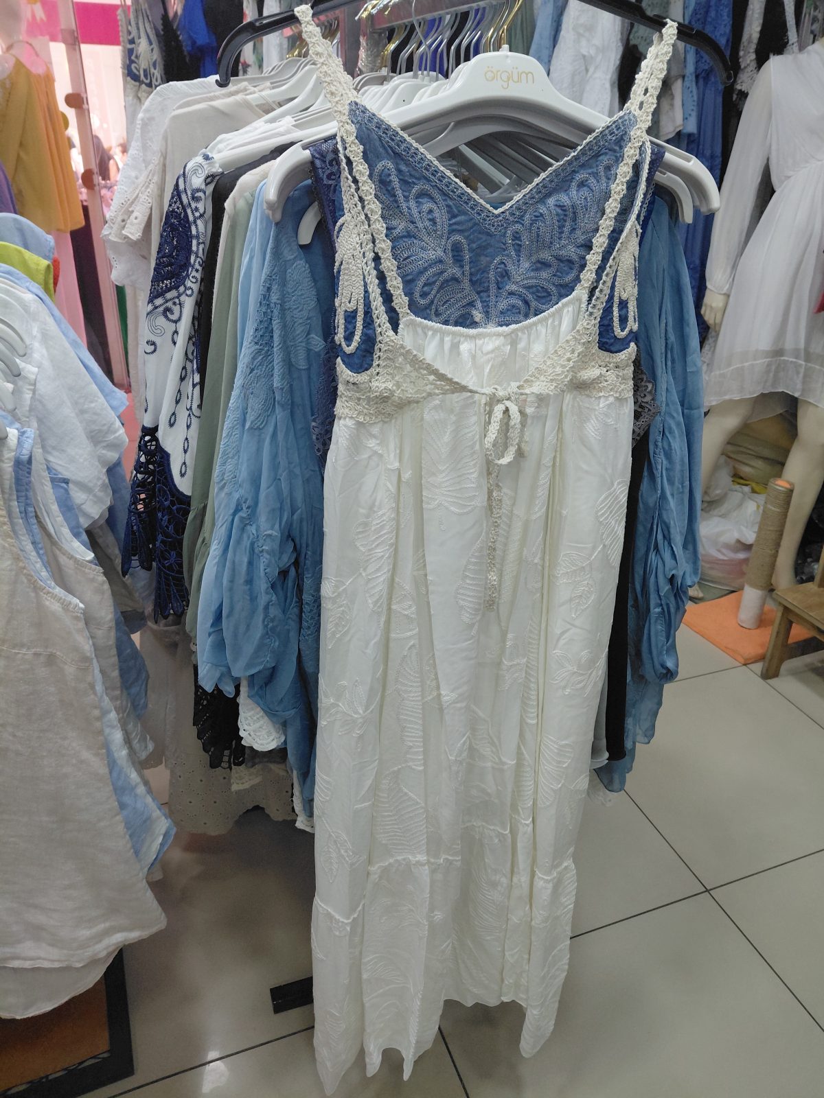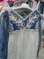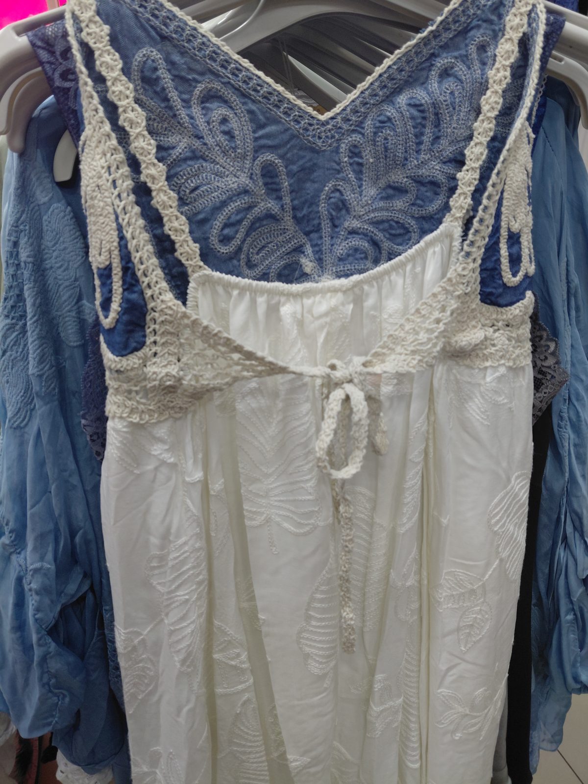 Örgü askılı elbise , arkası bağlama detaylı ve üst kısım kot görünümlü kumaştır. Elbise tamamı nakışlıdır